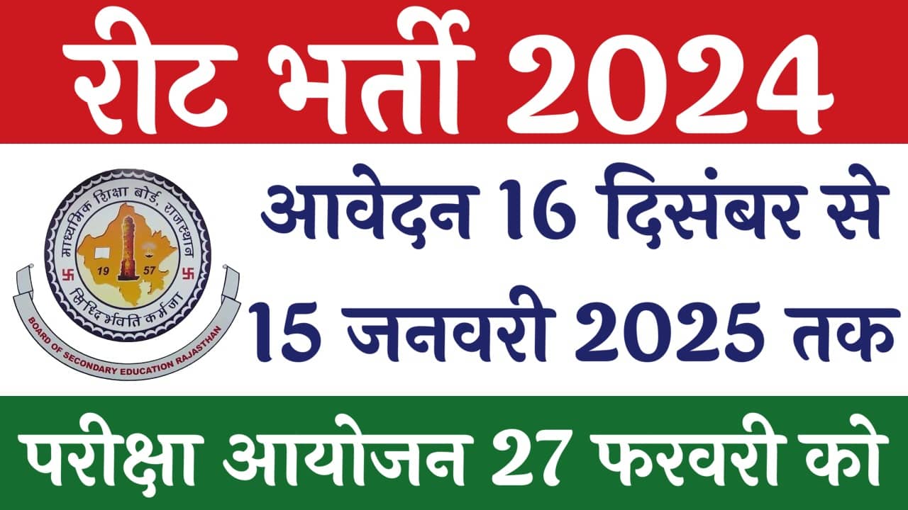 रीट 2024 का नोटिफिकेशन जारी आवेदन फॉर्म 16 दिसंबर से शुरू :राजस्थान शिक्षक पात्रता रीट के लिए अधिसूचना जारी कर दी गई है राजस्थान रीट के लिए ऑनलाइन आवेदन फार्म 16 दिसंबर से शुरू हो जाएंगे और आवेदन की अंतिम तिथि 15 जनवरी 2025 रखी गई है इसके बाद परीक्षा का आयोजन 27 फरवरी को किया जाएगा रीट प्रमाण पत्र की वैधता लाइफटाइम रखी गई है।